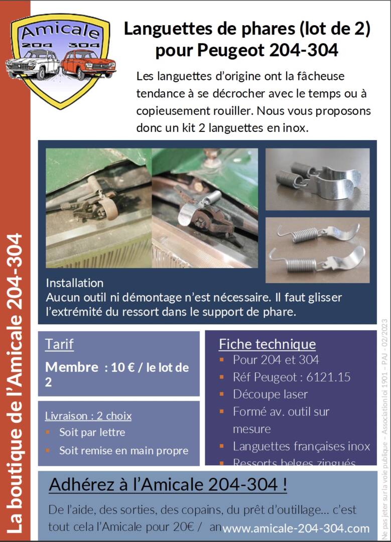 Les languettes d’origine des phares des 204 et 304 ont la fâcheuse tendance à se décrocher avec le temps ou à copieusement rouiller. L’Amicale vous propose donc un kit 2 languettes refabriquées en inox.